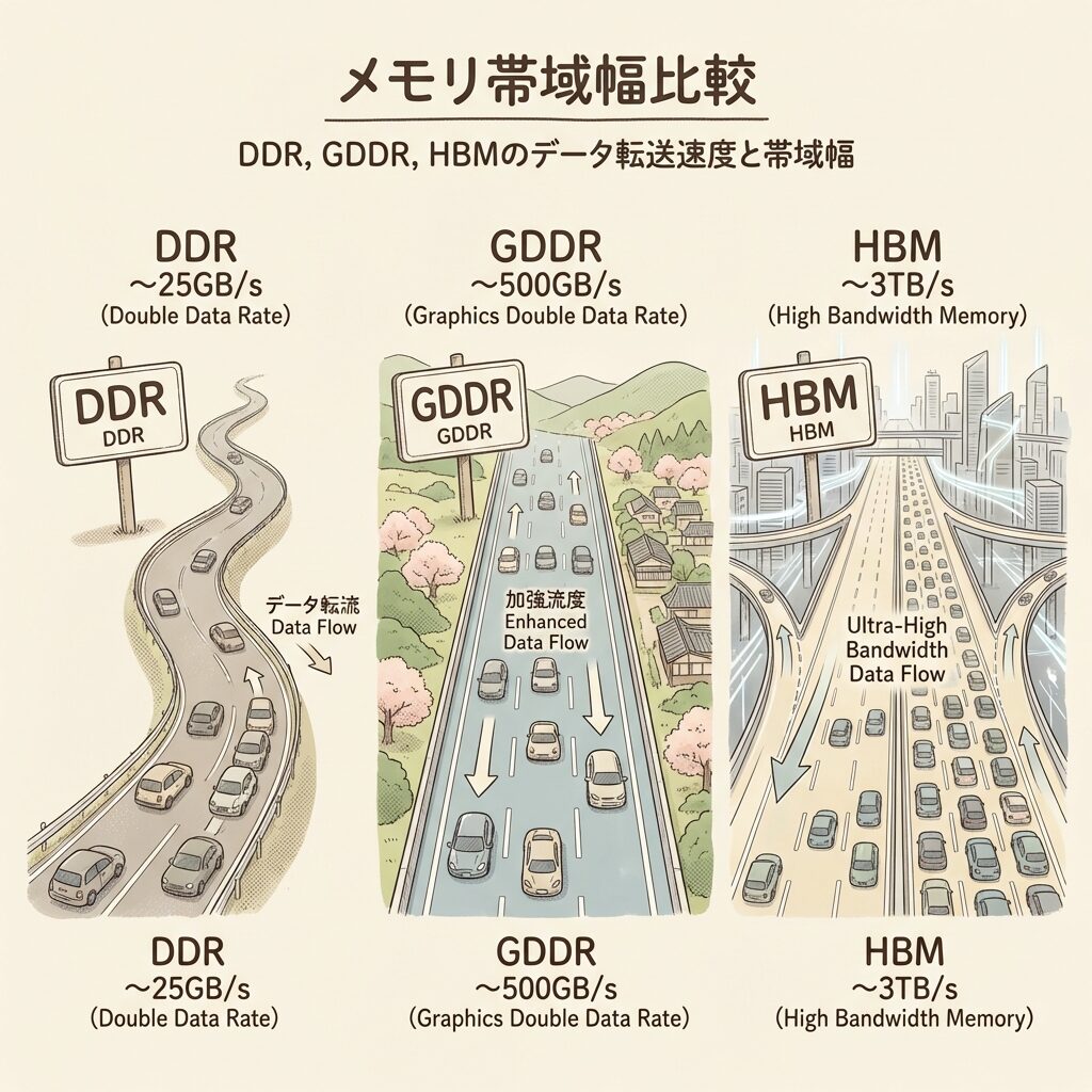 | 帯域幅(1ユニット) | 〜50 GB/s | 〜100 GB/s | 〜1.2 TB/s(1スタック) |