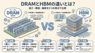 | TSV(貫通電極) | 層間接続 | 数千〜数万本で1024bit幅を確保。帯域幅の源泉 |