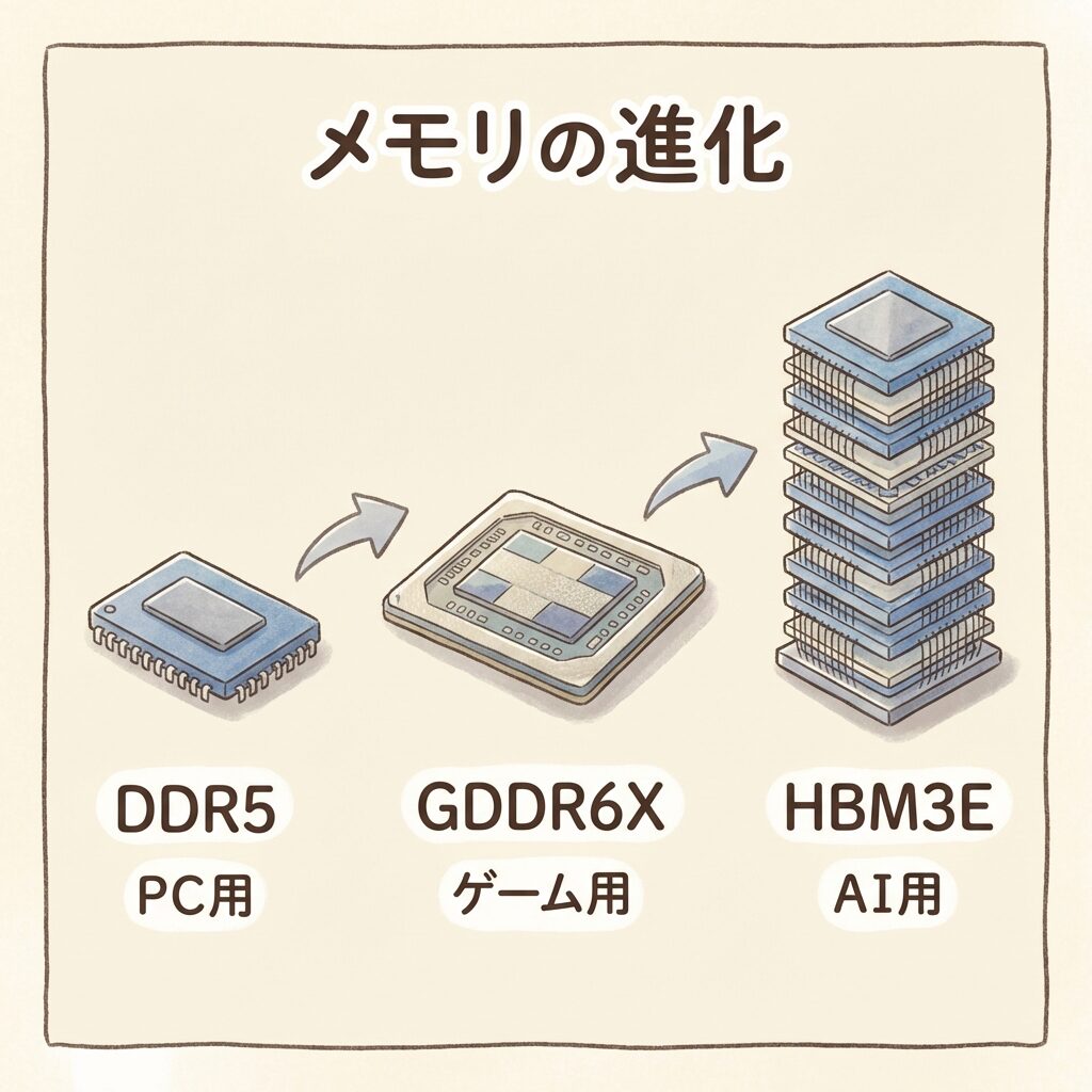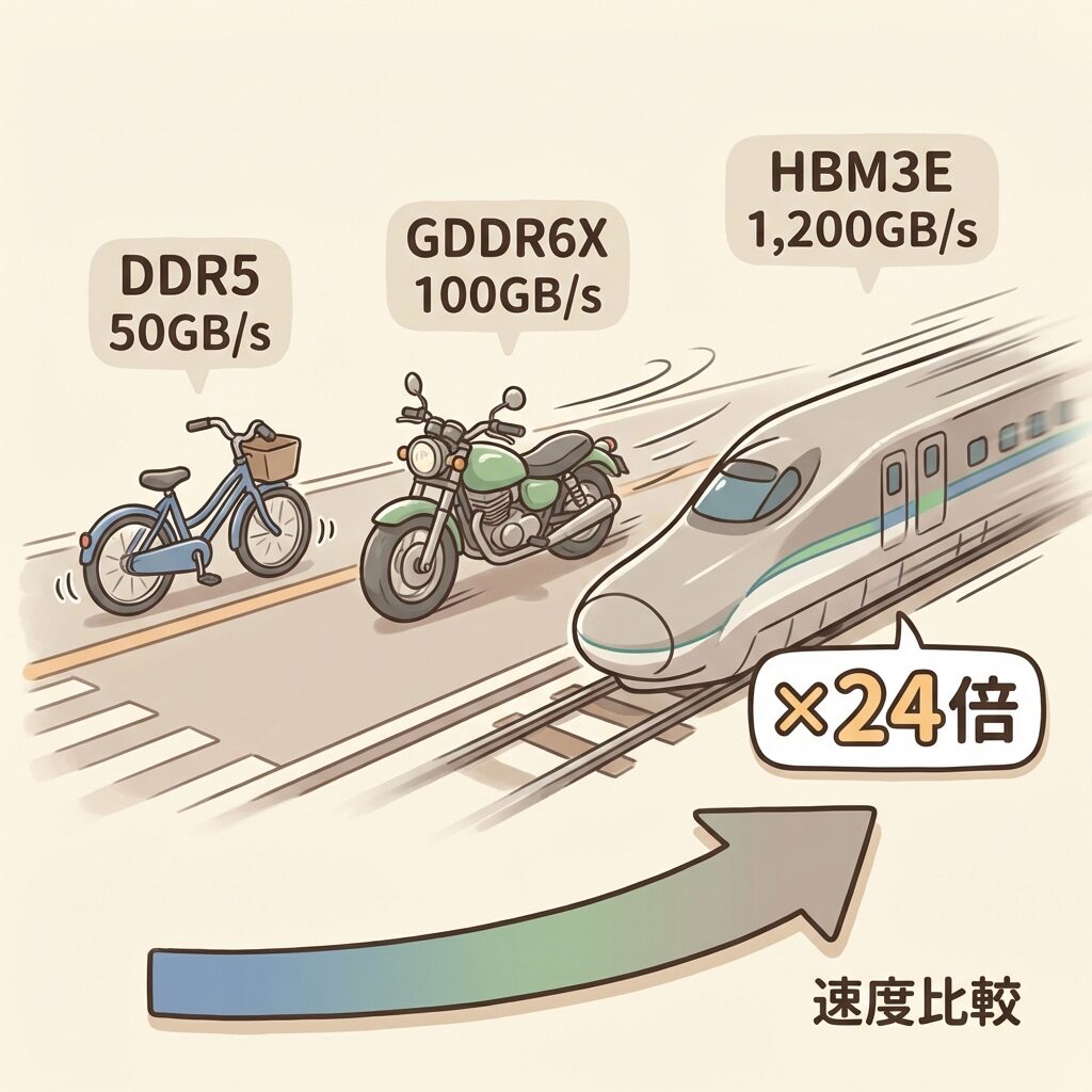 DDR5が「自転車(時速20km)」で荷物を運ぶとしたら、HBM3Eは「新幹線(時速480km)」です。同じ1時間でも、運べる荷物の量がまったく違います。AIが大量のデータを処理するには、この「新幹線」級のスピードが必要なのです。