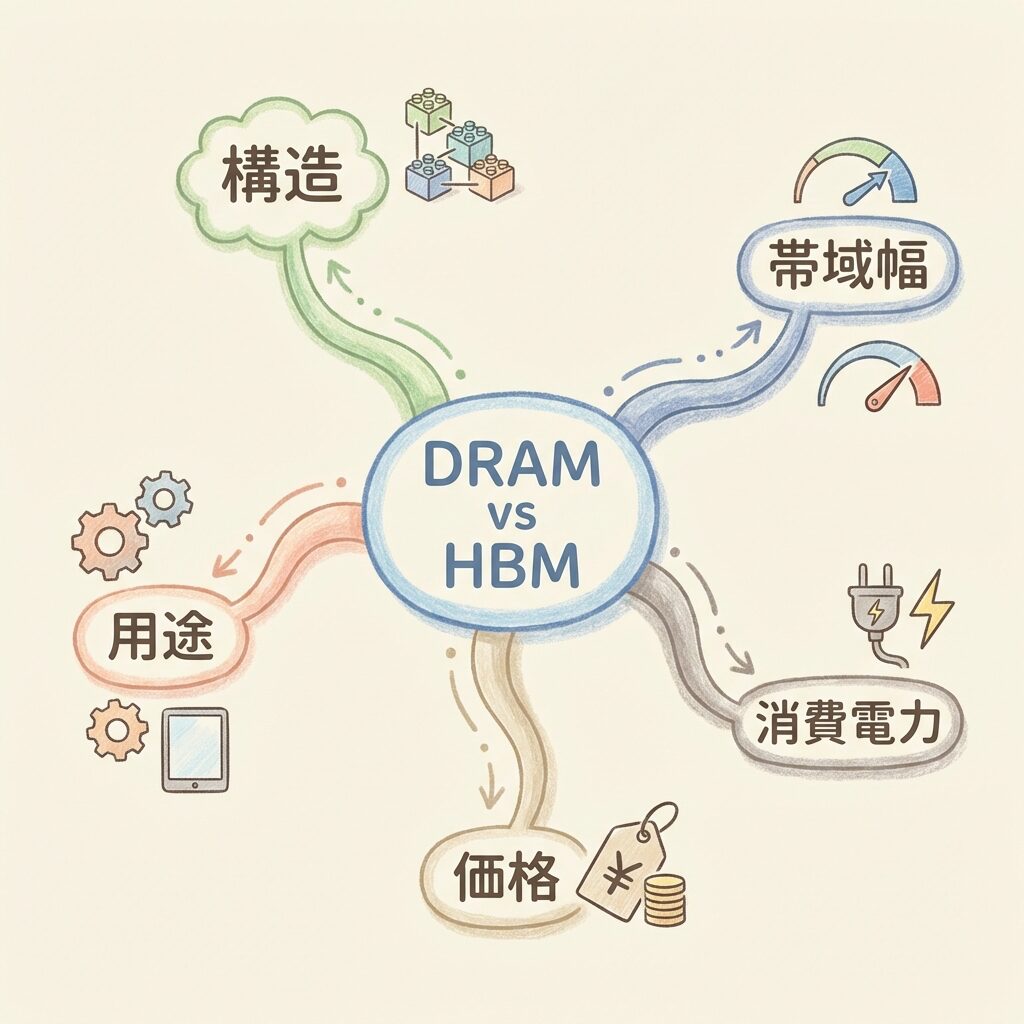 - DRAMとHBMの5つの比較視点(構造・帯域幅・消費電力・価格・用途)