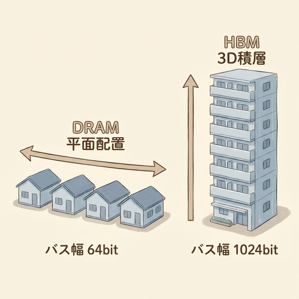 普通のDRAMは「平屋の家を横に並べた住宅地」です。土地(基板面積)をたくさん使います。HBMは「超高層マンション」。同じ土地に何十倍もの部屋(記憶容量)を詰め込めます。しかも、各階を縦に直接つなぐ「エレベーター(TSV)」があるので、データのやりとりが超高速です。