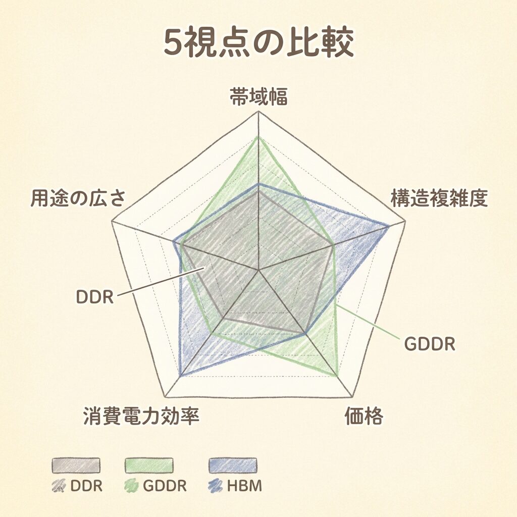 DRAMとHBMは、以下の5つの視点で比較するとその違いがはっきりと見えてきます。この地図を頭に入れてから各比較を読むと、より理解しやすくなります。