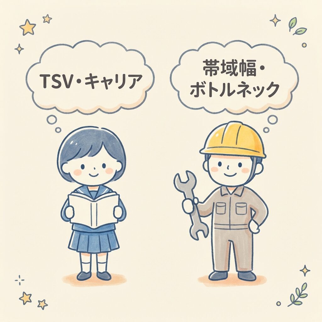 学生:「なぜDRAMを縦に積むと速くなるのか」という問いは、半導体物理・材料・製造プロセス・システム設計が交差する教育的な問いです。TSV・インターポーザー・2.5D/3D実装は、今後の半導体エンジニアが必ず直面する技術領域です。情報系だけでなく、電気・材料・機械系の学生にとってもキャリアに直結します。「DRAMとHBMの違いを説明できる」だけで、面接・研究発表での差別化になります。