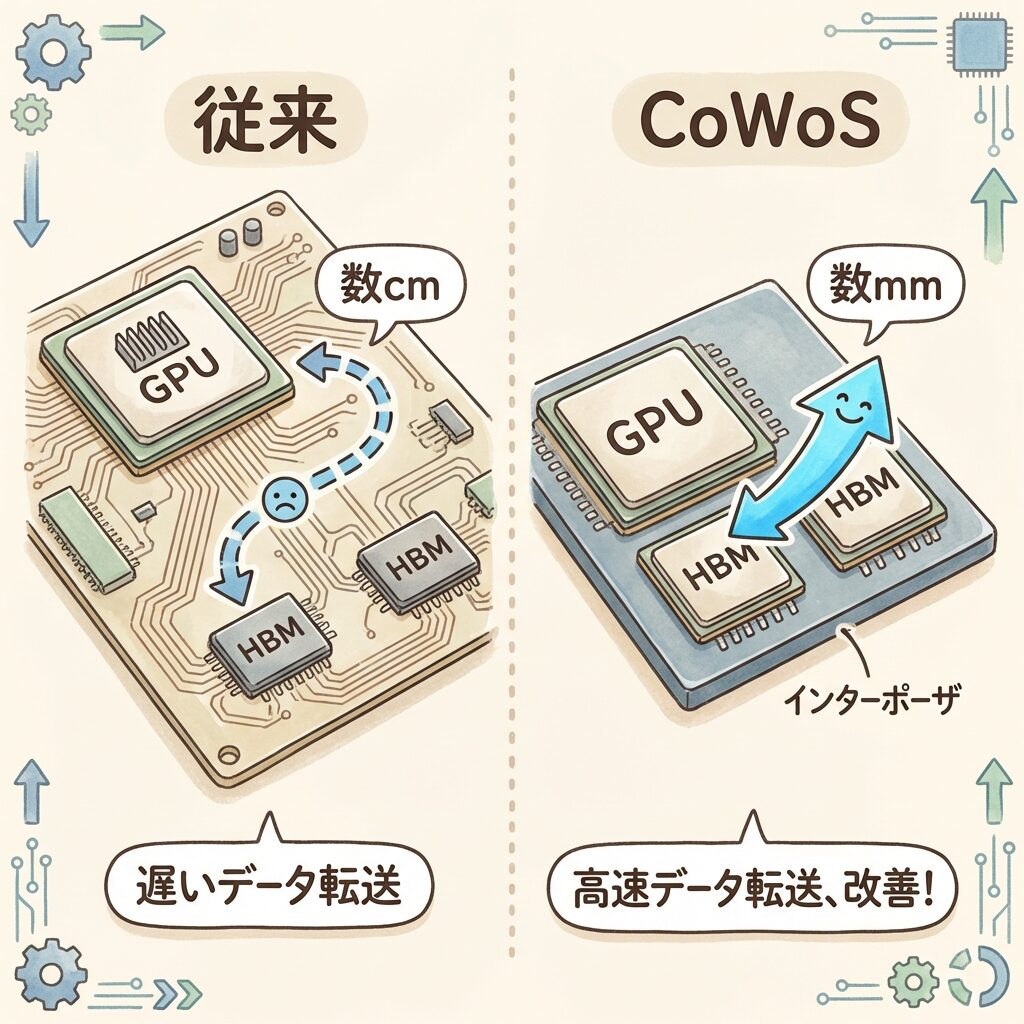 CoWoSは「超精密な模型の台座」のようなものです。GPUという「エンジン」と、HBMという「燃料タンク」を、台座(インターポーザー)の上にぴったり並べて、超細い配管(配線)でつなぐ。台座がなければ、エンジンと燃料タンクは遠く離れてしまい、燃料の供給が追いつかない──つまりGPUの性能が引き出せないのです。