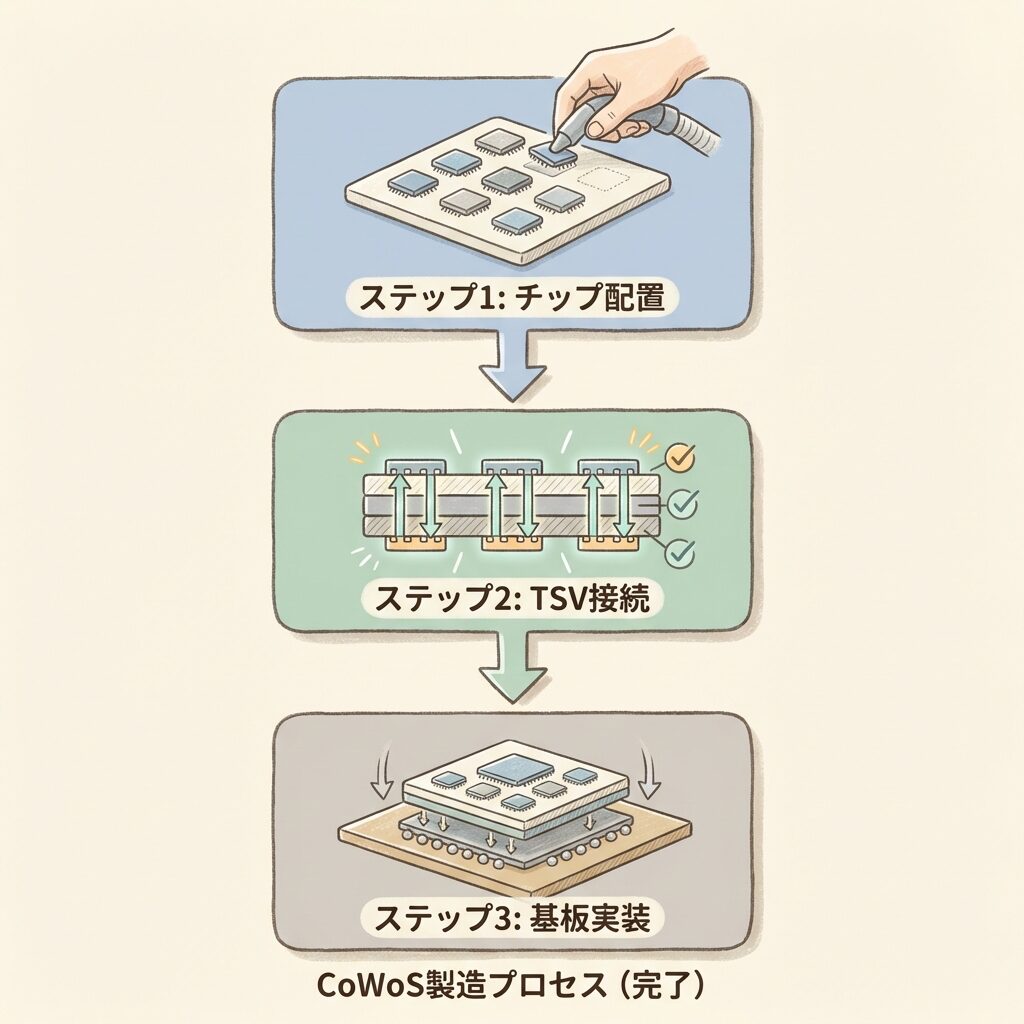 CoWoSの製造は「精密なジオラマ制作」に似ています。STEP 1で、精密な台座(インターポーザー)の上にミニチュアの建物(GPU・HBM)を正確に配置する。STEP 2で、建物同士が台座内の地下通路(TSV)でちゃんとつながっているか確認する。STEP 3で、台座ごとケースの中(パッケージ基板)に固定する。完成品は「見た目は1つのチップだが、中に複数の建物がある」状態です。