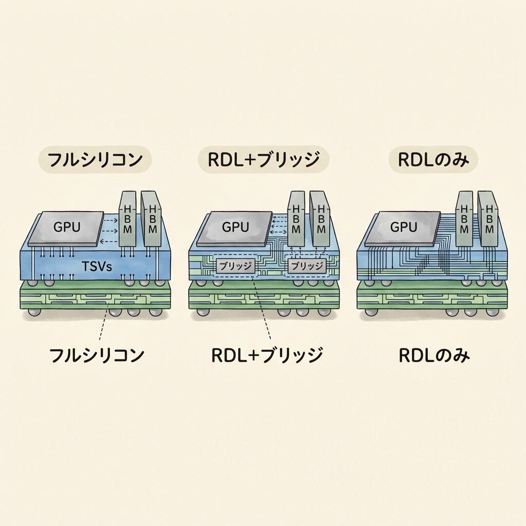 | インターポーザー | フルシリコン | RDL+局所シリコンブリッジ(LSI) | RDL(有機再配線層)のみ |