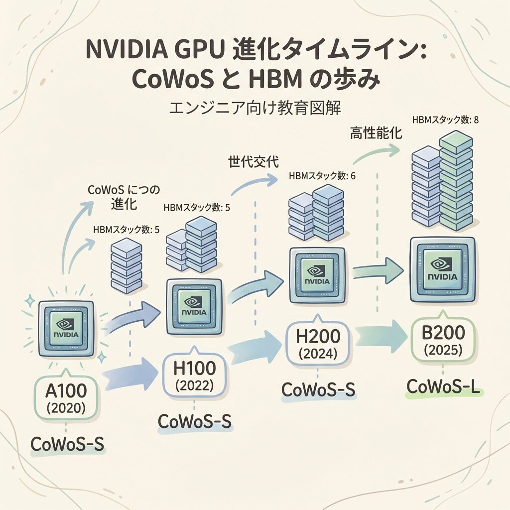 📅 GPU世代が進むたびに、CoWoSも進化してきた