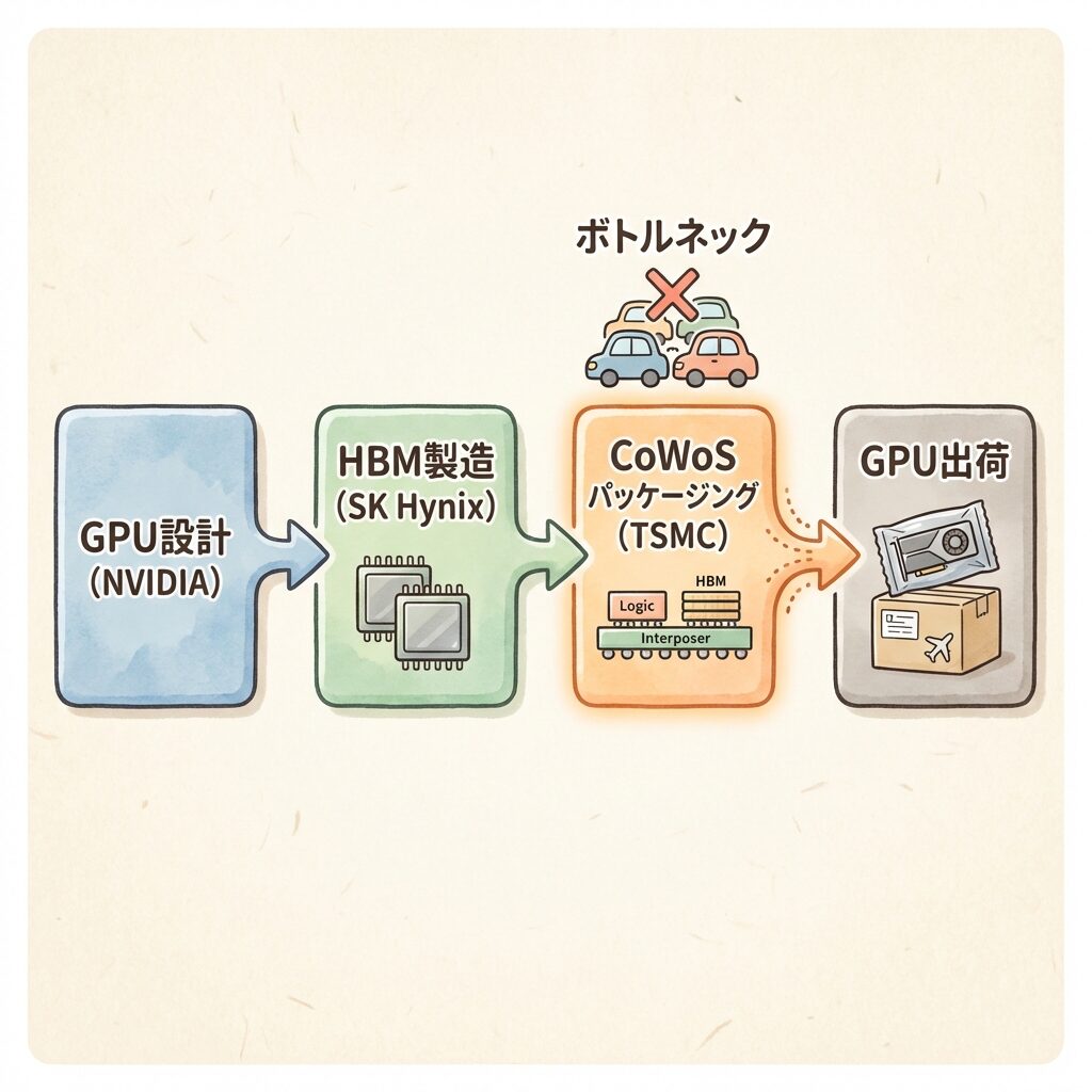 NVIDIAはGPUの「設計」を持っていますが、GPUを「製品」にするにはCoWoSパッケージングが必要です。そしてCoWoSを量産できるのは、事実上TSMCだけです。この構造が、AI半導体の供給に深刻なボトルネックを生んでいます。