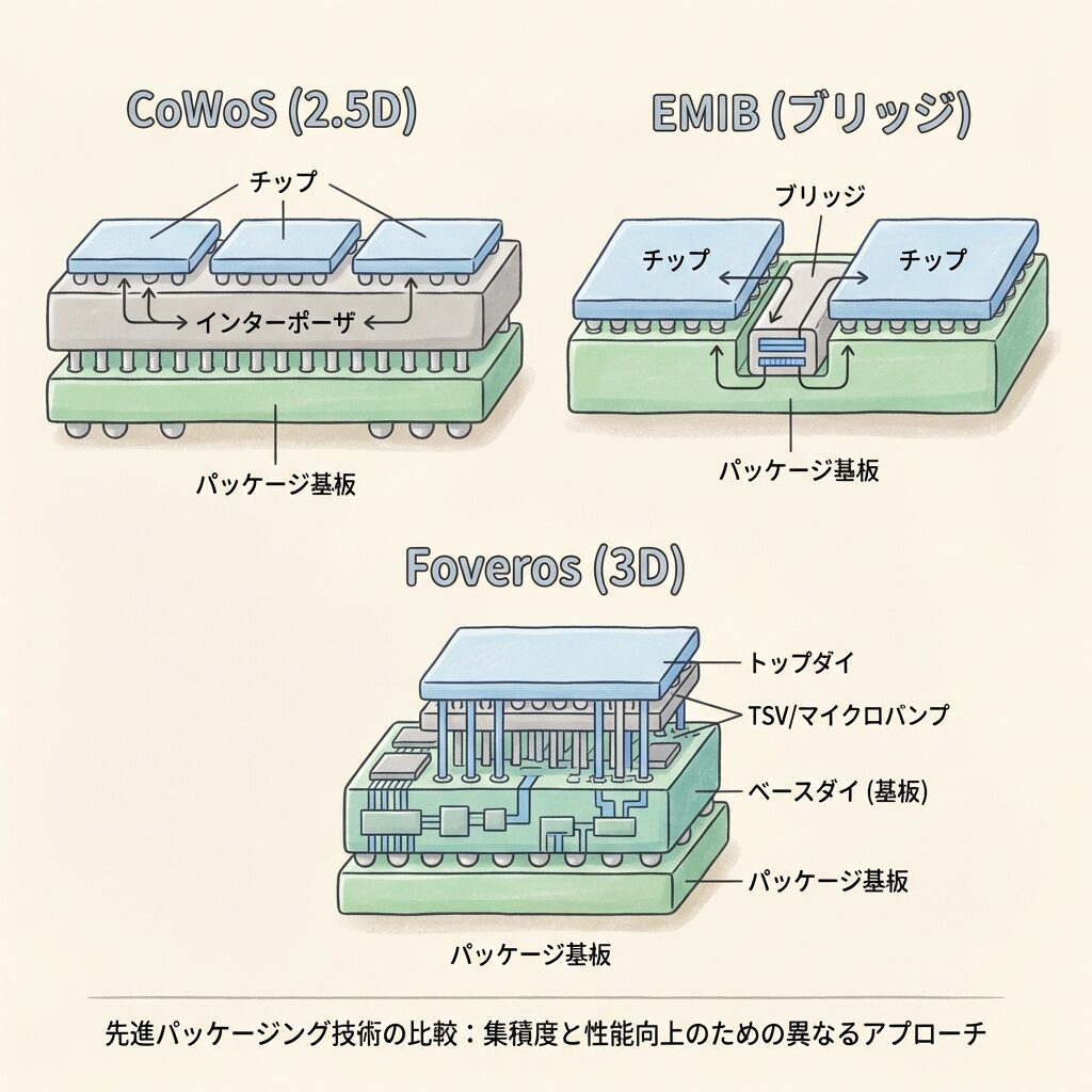 | CoWoS | TSMC | インターポーザー上にチップを横並び(2.5D) | AI GPUの事実上の標準。製造成熟度が最も高い |