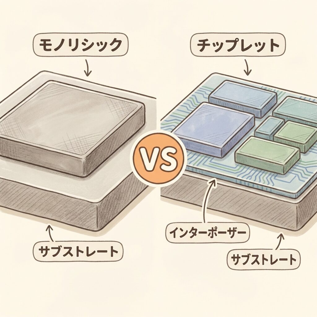 「チップレット」という言葉、AIや半導体のニュースで急に見かけるようになりましたよね。でも「結局何が新しいの?」「モノリシックとどう違うの?」と聞かれると、うまく説明できない──そんな方は少なくありません。