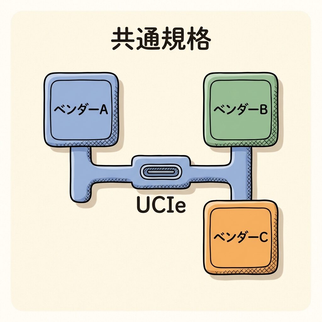UCIeは「チップレット版のUSB規格」です。USBが登場する前、プリンターやマウスはメーカーごとに違うコネクタでした。USBが「共通の差し口」を決めたことで、どのメーカーのデバイスもつなげるようになった。UCIeは同じことを、半導体パッケージの内部で実現しようとしています。