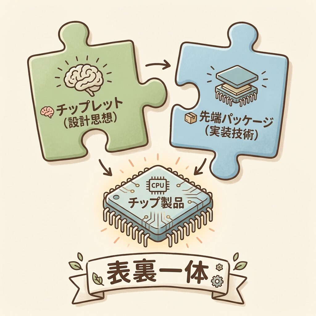 チップレットは「こう設計しよう」という発想・アーキテクチャであり、CoWoS・EMIB・SoICは「その設計を現実の製品にする」ためのパッケージ実装技術です。チップレットだけあっても、それを統合するパッケージ技術がなければ製品にならない。逆に、パッケージ技術だけあっても、分割されたチップレットがなければ活かす対象がない。両者はセットで初めて意味を持ちます。