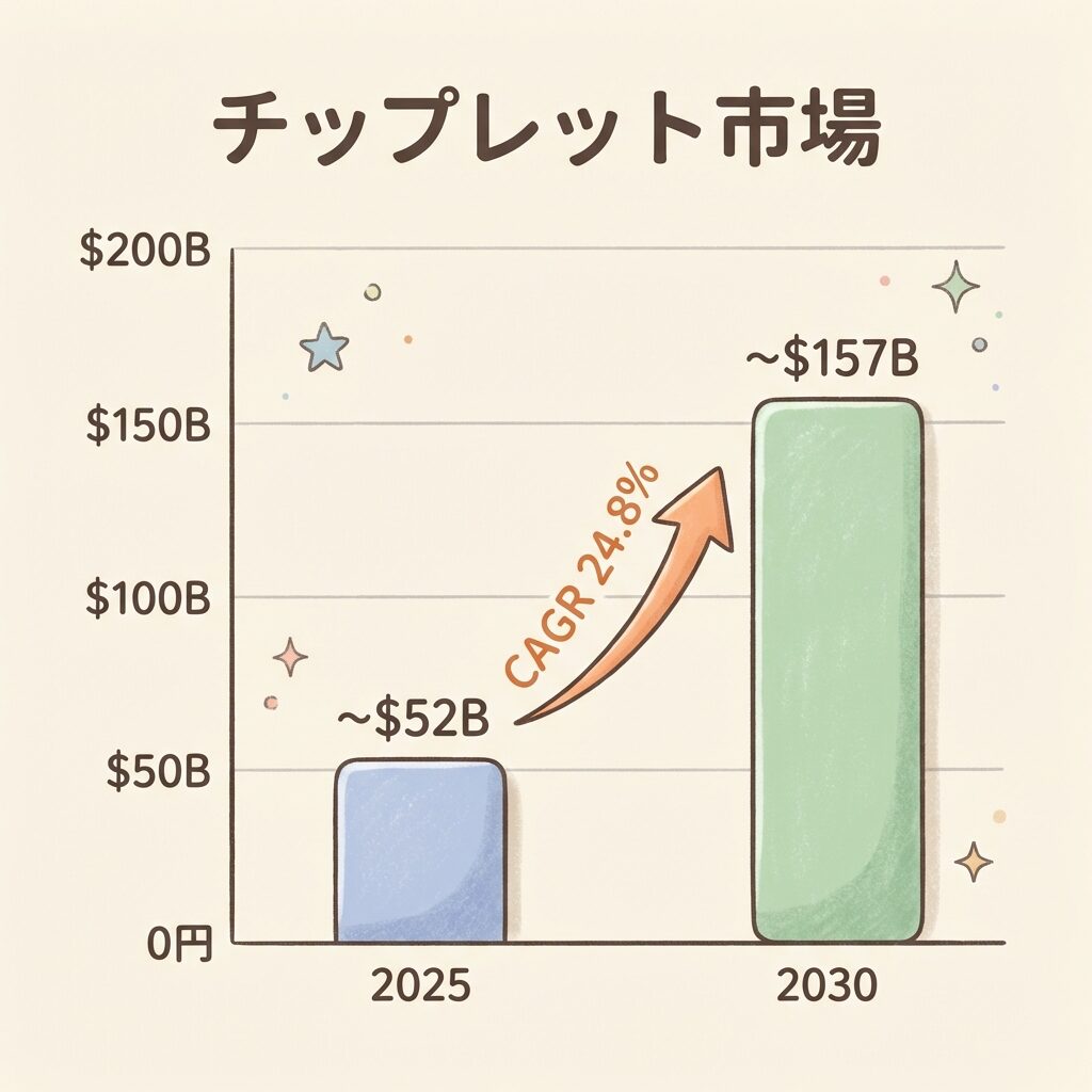 チップレット市場は、AI・HPC・データセンター需要を背景に急速に拡大しています。MarketsandMarketsの予測によると、チップレット市場は2025年の約519億ドルから2030年に約1,572億ドルへ、CAGR(年平均成長率)24.8%で成長する見通しです(出典:MarketsandMarkets / PR Newswire)。