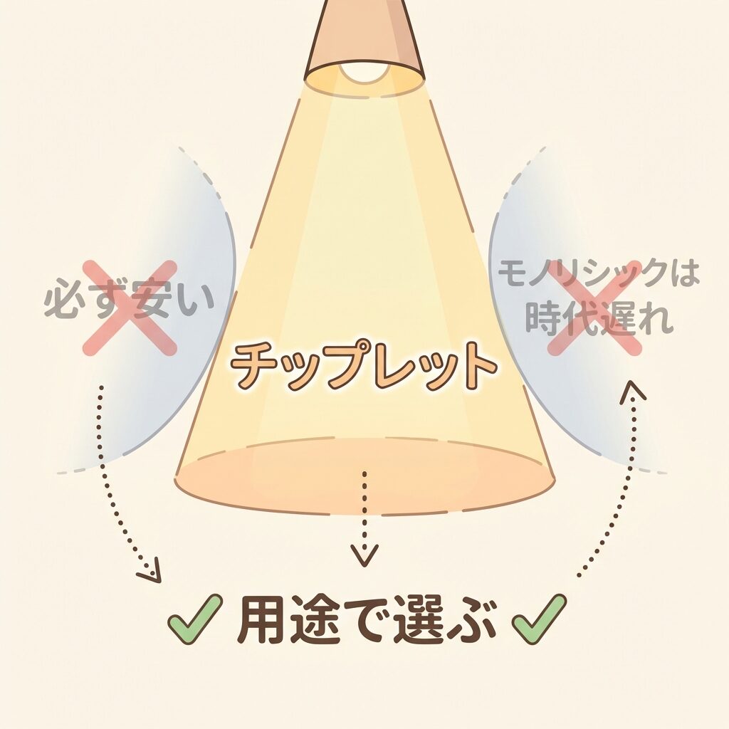 「チップレットにすれば必ず安くなる」 先端パッケージの追加コストがかかるため、ダイサイズが十分に大きく歩留まり改善が追加コストを上回る場合にのみコストメリットが出る。小型チップではモノリシックのほうが安いこともある。