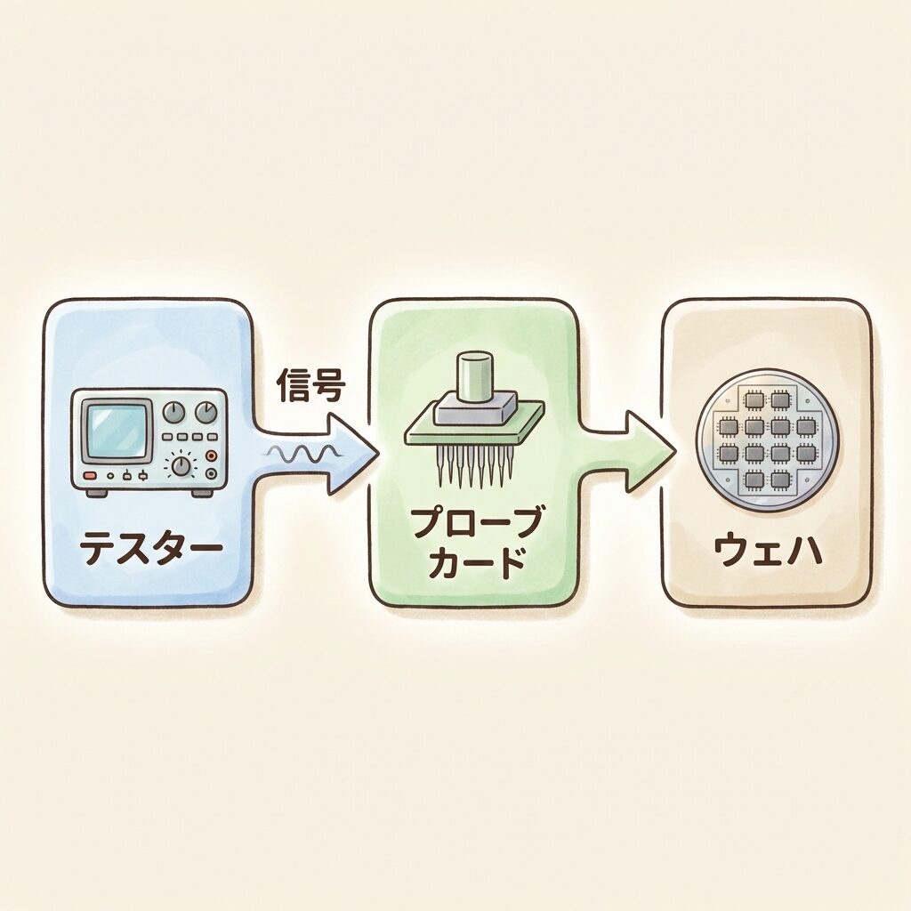 A. テスター(テスト装置)はテスト信号を生成・送受信し、チップの良否を「判定する本体」です。プローブカードはテスターとウェハを「物理的につなぐ治具」です。テスターが「医師の判断」なら、プローブカードは「聴診器」に相当します。両者はセットで機能し、どちらが欠けてもウェハテストは成立しません。
