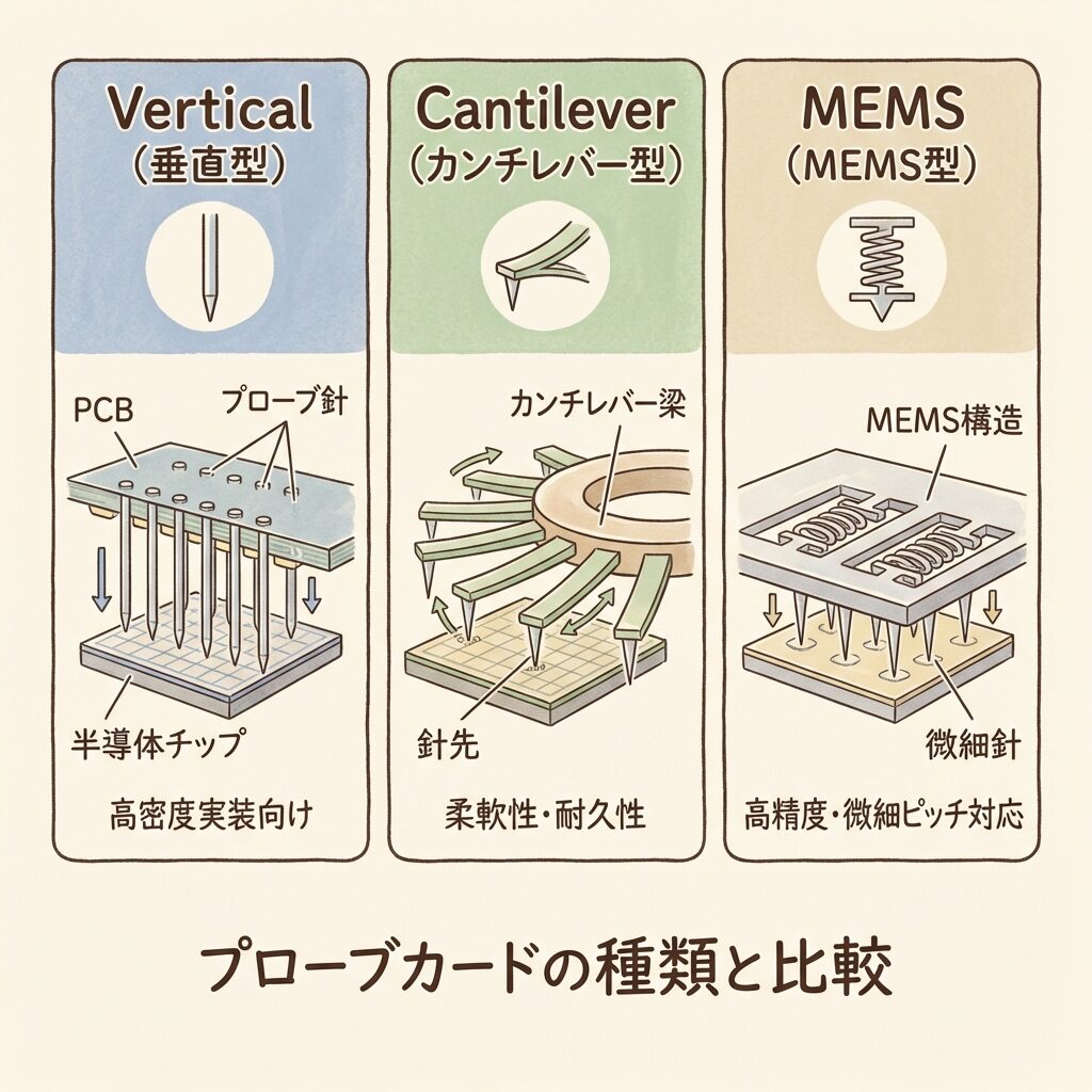 プローブカードの種類は、大きく垂直型・カンチレバー型・MEMS型の3つに分かれます。違いは「針をどう基板に取り付けるか」──この1点だけです。構造が違えば対応ピッチ・コスト・メンテナンス性がすべて変わるため、検査対象に応じて使い分けられています。