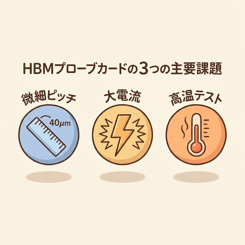 プローブカードはDRAMやロジックICなど様々な半導体の検査に使われていますが、HBM向けのプローブカードは通常品と比べて格段に高い技術要求を突きつけられています。その理由を3つに分けて整理します。