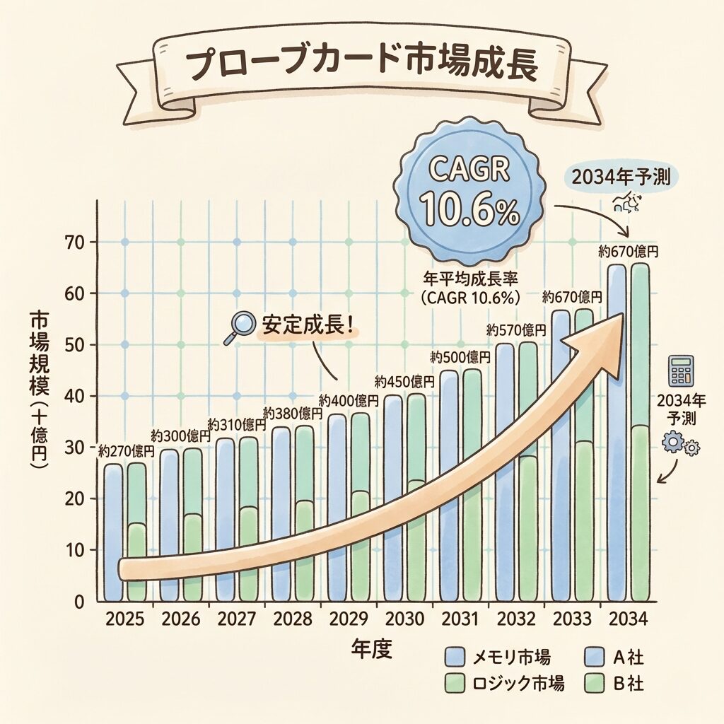 調査機関によって市場規模の数字に差がありますが、これは「プローブカード」の定義範囲(先端品のみか全体か、付随部品を含むか等)が異なるためです。共通しているのは「年平均6〜11%成長」「AI・HBM需要が構造的ドライバー」という点。トレンドの方向性を読むことが重要です。