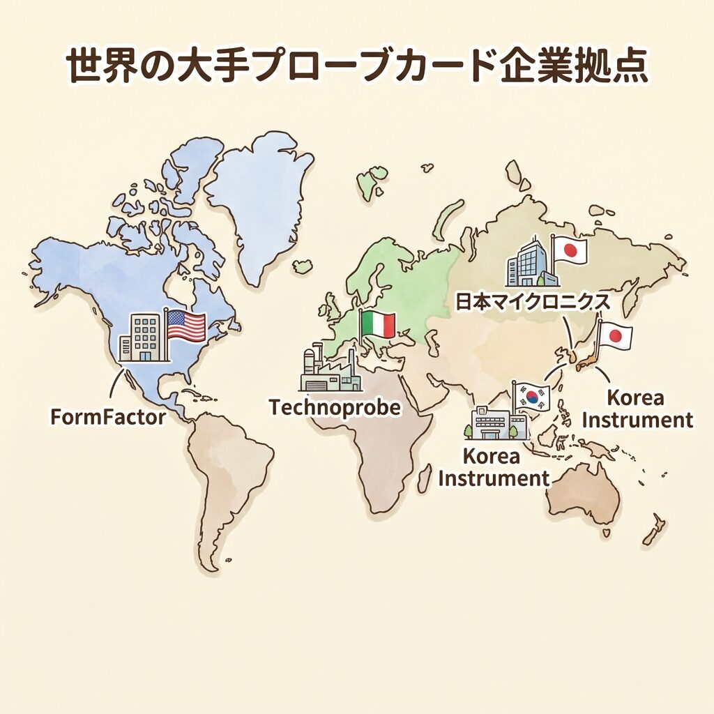 プローブカード市場は、少数の企業が大きなシェアを握る寡占構造です。特にHBM向けの先端プローブカードは技術的参入障壁が極めて高く、供給できるメーカーは世界でもごく限られています。