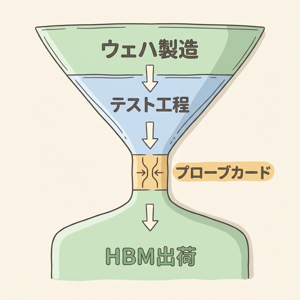 HBMの供給は「水道のホース」のようなものです。ウェハ工場が「蛇口」を全開にしても、ホースの途中に「プローブカード」「テスト装置」「バーンイン設備」という3つの細い部分があると、最終的に出てくる水(出荷量)はその最も細い部分で決まる。今、その最も細い部分のひとつがプローブカードなのです。