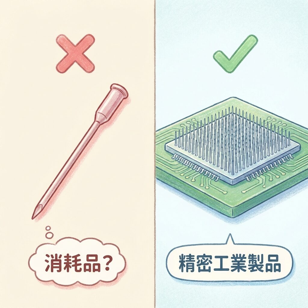 通常のプローブカードが「普通の裁縫針で布を縫う」だとすると、HBM向けは「髪の毛より細い針を、サウナの中で、電流を流しながら、0.04mmの間隔で正確に突き刺す」ようなもの。しかもそれを数千本同時に、数万回繰り返す──その難しさがイメージできるでしょうか。