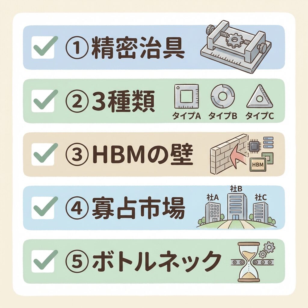結局こういうことです。プローブカードは「半導体チップの健康診断器具」であり、HBM時代にはその診断の難易度が劇的に上がっています。微細ピッチ・大電流・高温という3つの壁を越えられるMEMS型プローブカードを作れる企業は世界に数社しかなく、この寡占構造がプローブカードを「見えにくいが極めて重要な供給制約」にしています。AI半導体の供給構造を「表面の製品(GPU・HBM)」だけでなく「裏側の検査部材(プローブカード・テスター)」まで見通せると、投資判断も技術理解も一段深くなるはずです。