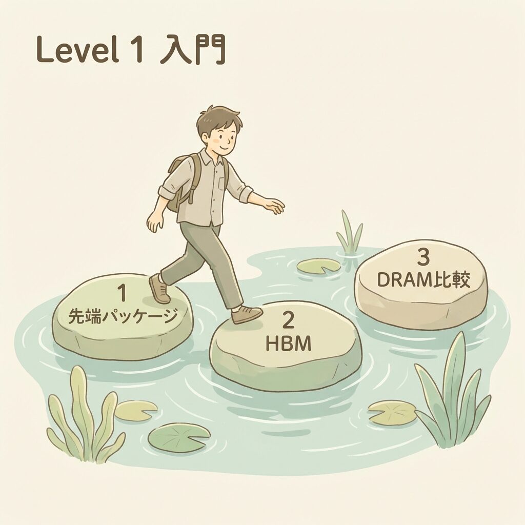 「先端パッケージの全体像がわかる」「HBMがDRAMの何倍速いか説明できる」「なぜAIにHBMが必須なのか理由を言える」──この3つができていれば、Level 2に進む準備完了です
