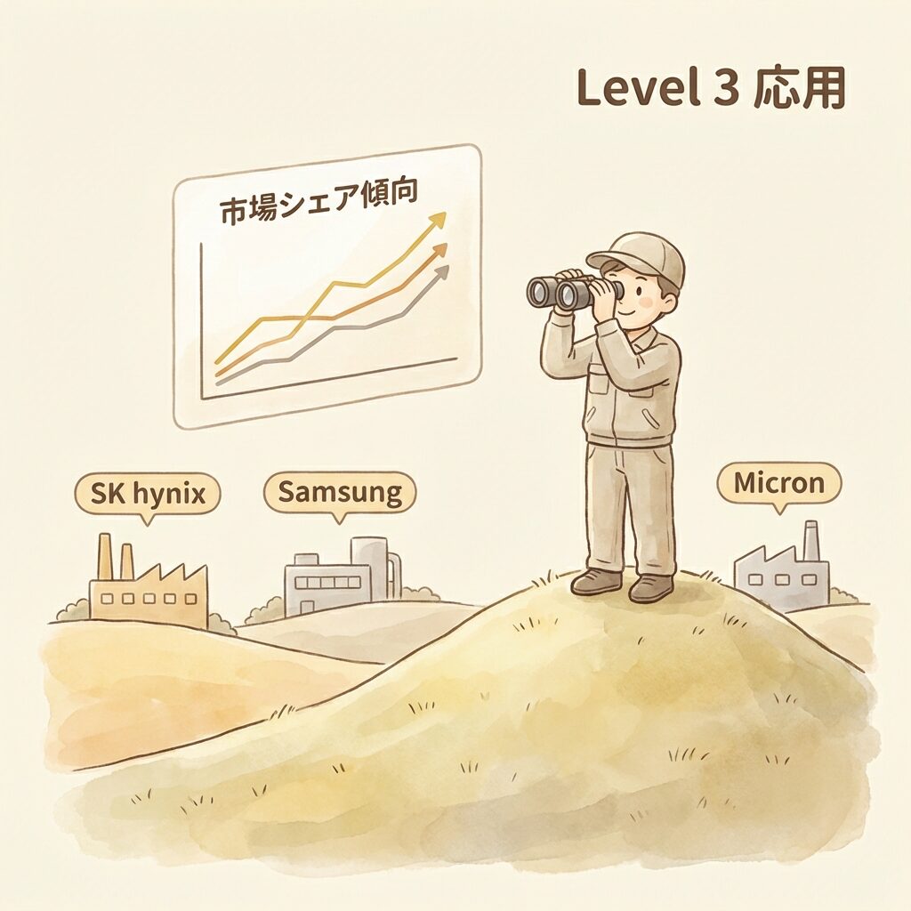 「SK Hynixがなぜ強いか、構造で説明できる」「Samsungの巻き返し戦略の論理が読める」「HBMの次世代交代がシェアをどう動かすか仮説を持てる」──技術と産業構造の両方を語れる状態です。投資判断、キャリア判断、業界分析のすべてに使える知識基盤が完成しています。
